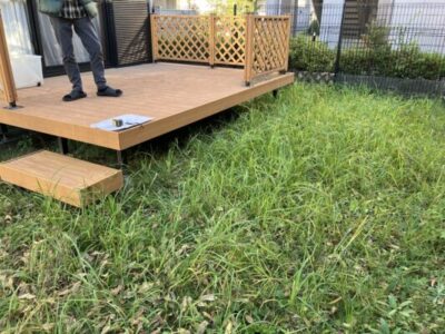 既存木製ウッドデッキの解体後、メンテフリーの樹脂製ウッドデッキ作成。天然芝もこの機会に人工芝にする事で今まで庭のメンテナンスに十分な時間が取れなかった悩みを一気に解決。生まれ変わった庭でペットとご家族で十分に楽しむ事が出来ます。 部屋から段差なしで人工芝敷の庭へ リビング前の庭を芝生から木目調タイルテラスへ作りかえる事で庭と家の中の行き来を楽にして使い勝手の良い空間に仕上げました。 生垣を撤去した後でリビングの窓の前にウッドデッキと日除けパーゴラそして物干し竿を設置、格段に使いやすい庭に大変身。 何かと面倒な庭の雑草抜き。手入れがなかなか出来ない庭を念願だったウッドデッキと人工芝に作り変え。 建築時50年は持つと言われたハードウッドのデッキが15年で床が腐って作り変えを決断。解体してメンテナンスフリーの樹脂製ウッドデッキを作成。 リビングとダイニングの両方の窓から出入りできるウッドデッキを作成。 リビング前の窓からスムーズに出入りできるウッドデッキを作成。子供のあそび場所や天気の良い日は物干し場所として活用。 リビングの窓と勝手口の窓からスムーズに出入りできるタイルテラスを作成。窓の前にはシニアのご夫婦が無理なく使えるように段差を少なくさせるステップと手摺をつけて長くお使い頂けるようにしました。 リビング前の窓から出入りができるウッドデッキを作成し雨の日でも安心できるテラス屋根を設置。 敷地の一部が傾斜地になっている土地を有効活用するためにウッドデッキを作成。素材はアルミの柱や梁でメンテナンスフリーは必須です。ウッドデッキ(守山区)
